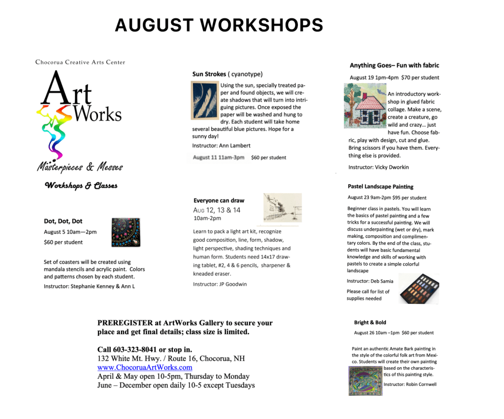 We’ve got a great lineup of hands-on workshops — perfect for beginners and experienced artists alike. Whether you’re looking to try something new or sharpen your skills, there’s something for everyone.